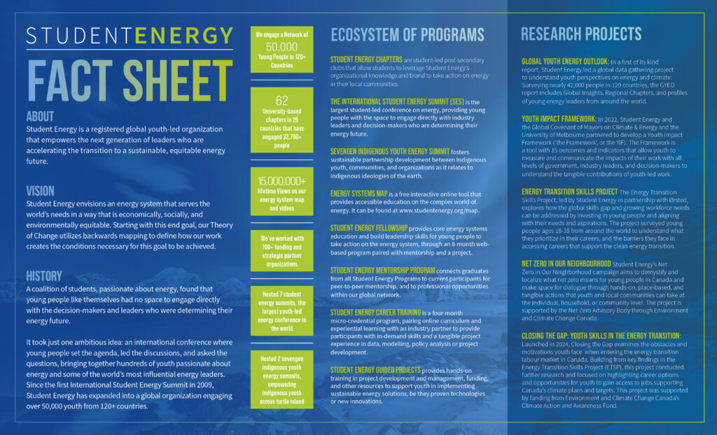 We’ve created a Fact Sheet to give a brief overview of Student Energy that has all basic information on our history, mission, programs and key stats that can be quickly downloaded and printed.